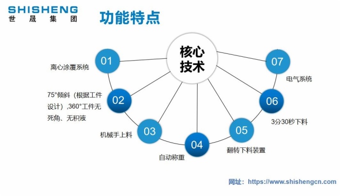 世晟集團(tuán)800系列全自動(dòng)達(dá)克羅涂覆生產(chǎn)線(xiàn)的設(shè)計(jì)和制造,是基于使用各種有鉻、無(wú)鉻達(dá)克羅涂料(水劑和油劑)對(duì)金屬工件進(jìn)行表面涂覆工作,也可用于其它非鋅鋁涂料的零件表面涂覆、著色或封閉加工。全自動(dòng)浸甩一體機(jī)由浸槽(SUS304)、甩干機(jī)構(gòu)(可傾斜)、槽體、槽蓋、涂液攪拌裝置、涂液回收裝置、涂液溫度調(diào)節(jié)系統(tǒng)、工件回轉(zhuǎn)輸送系統(tǒng)(升降采用氣缸)、涂液攪拌控制系統(tǒng)和料筐、小車(chē)翻轉(zhuǎn)上料裝置、伸縮式網(wǎng)帶輸送機(jī)、稱(chēng)重系統(tǒng)。