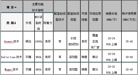 對Geomet系列、Delta-Tone系列、Magni系列三項無鉻技術(shù)進行比較,Geomet無鉻涂料底涂、面涂均為水性涂料,且Geoemt技術(shù)得到國際幾乎所有主流汽車廠家的認可,而Delta-Tone系列和Magni系列底涂為水性涂料,但面涂仍為有機溶劑型涂料,只是僅被部分廠商認可。